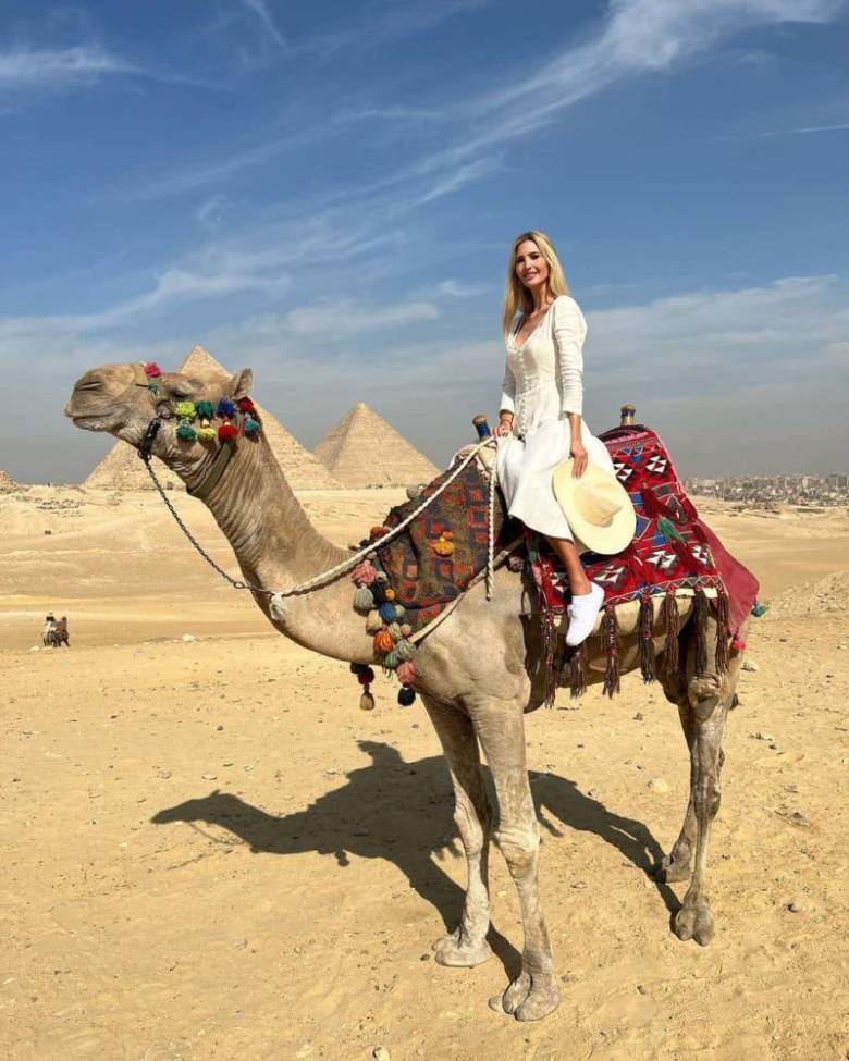 ونشرت إيفانكا صوراً لها ولعائلتها، يمتطون الجمال والأحصنة، وفي خلفيتهم الأهرامات وأبو الهول. وغردت قائلة: «يوم في الأهرامات.. إنه لأمر مميز جداً استكشاف جمال مصر لأول مرة مع عائلتي».